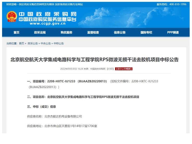 中标:北京航空航天大学-MUEGGE微波等离子去胶机